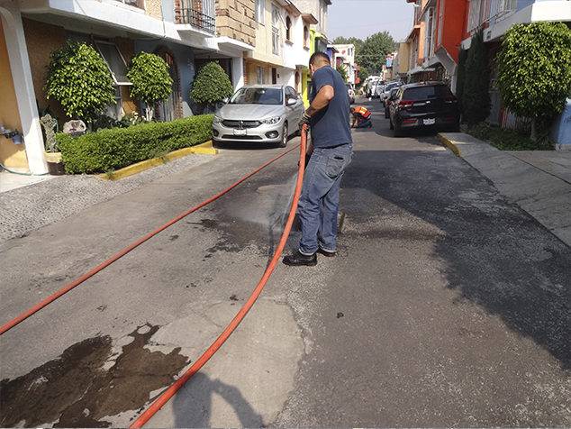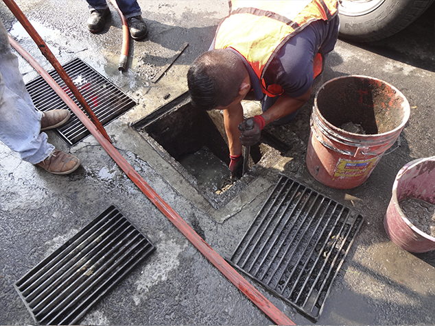 Desazolve de drenaje con camión vactor de 12 m3, camión sisterna de 6 m3 y camión de alta presión de 12 m3.
